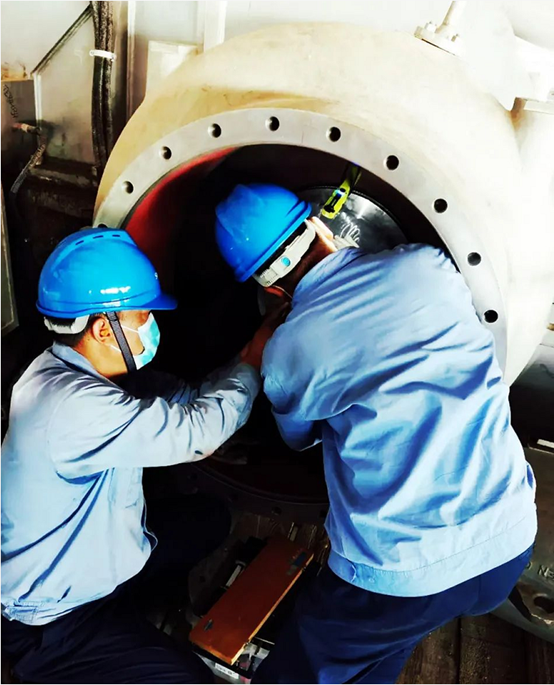 此次磨练的是入口多轴机组,,,,,,,结构与国产机组略有差别,,,,,,,需要拆卸的管道、蜗壳、仪表等小部件众多,,,,,,,仅拆卸机组就需要磨练职员破费极大地耐心和更长的时间。。。 。。。。 。依附多年的事情履历,,,,,,,项目司理李军合理安排拆卸顺序,,,,,,,并要求各人将每一个拆下的零部件都仔细做好标识并包装归放整齐,,,,,,,阻止遗失影响回装事情。。。 。。。。 。在他的向导下,,,,,,,团队成员有条不紊的开展各自事情,,,,,,,仅用了一天时间,,,,,,,就完成了机组拆卸事情,,,,,,,他们的专业和高效给急于恢复生产的用户吃下了定心丸。。。 。。。。 。